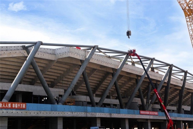 技术赋能建造,缔造卓越品质。项目设计有大跨度钢结构屋面,最大提升高度达26米,最大跨度达154米,如何安全高效地完成桁架安装,保证高空拼装精度、姿态调整、空间定位是摆在项目建设者面前的一道难题。